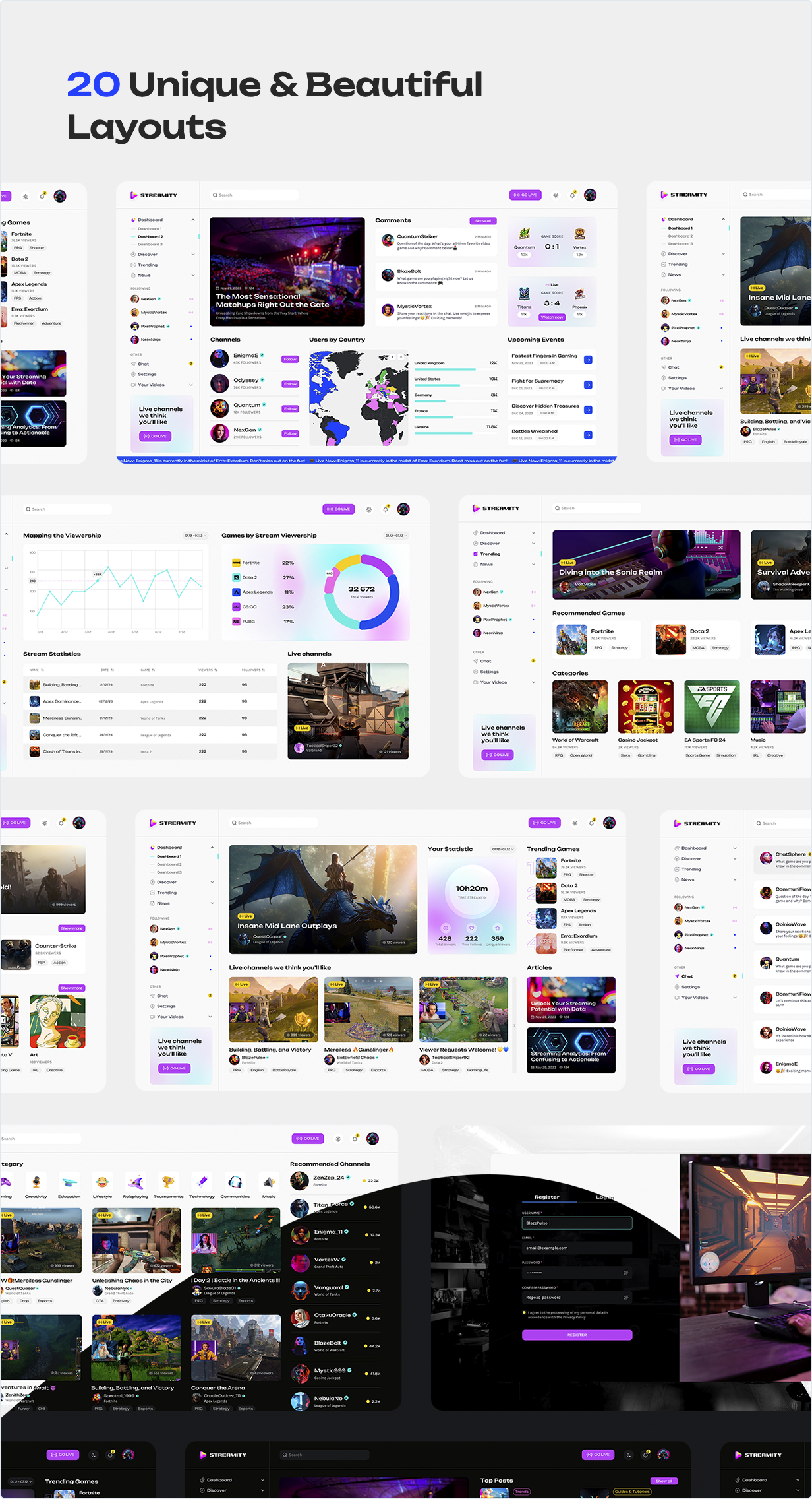 The Streamity Dashboard encompasses 20 meticulously designed screens, offering a versatile platform for effortless management, exploration, and interaction with gaming content across diverse streaming and social gaming platforms.
