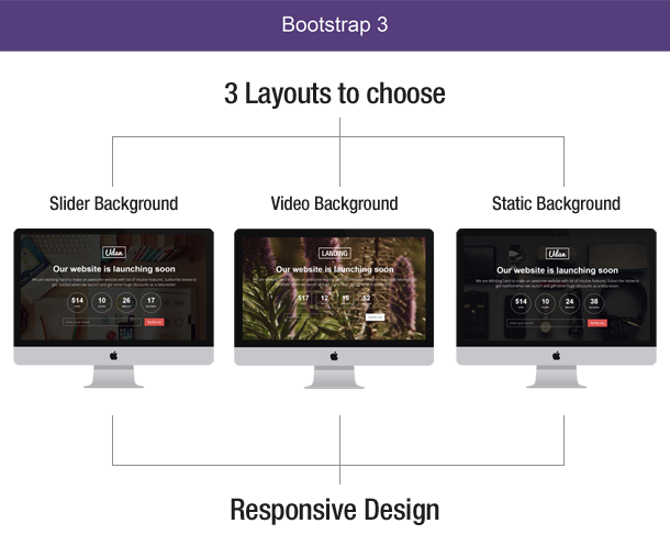 Udan is a Flat Responsive coming soon template based on latest BOOTSTRAP 3.This template includes 6 different Layouts with Video, Slider and Image backgrounds. As it is responsive, you can view it in any devices.