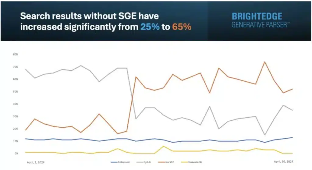 De récentes données révèlent une augmentation spectaculaire des requêtes de recherche Google sans résultats de Search-generated Experience (SGE), passant de 25% à 65%. Cette évolution, survenue en avril dernier, s’accompagne d’une diminution de l’espace occupé par les réponses SGE.