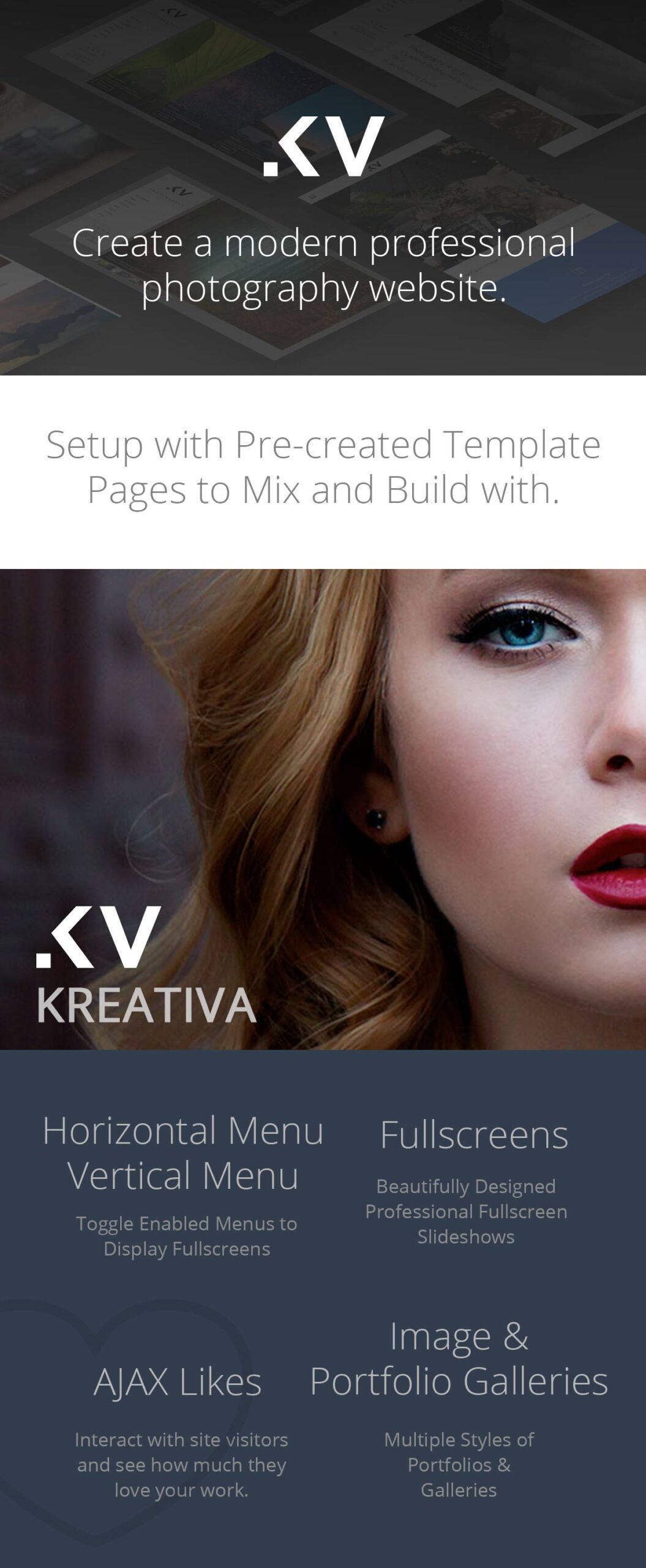 Kreativa Photography theme is a feature rich theme for professional photographers. It includes proofing, events, fullscreens, portfolios and galleries for photographers to create a unique website.