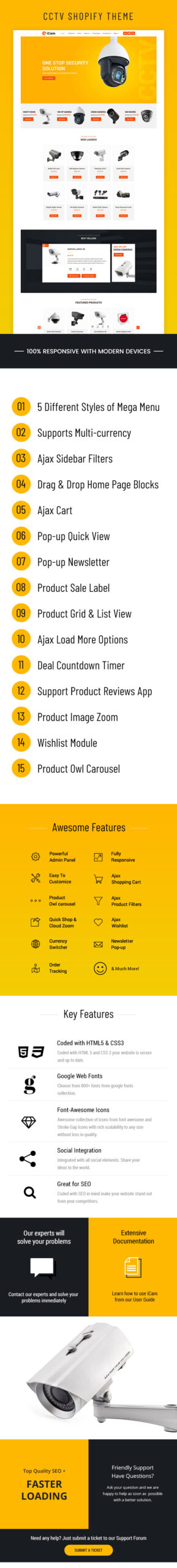 The Icam is an impressive Shopify theme created for the online stores selling the camera, mobile, gadgets, electronics, and cctv, camera, camera shop, camera store, security company, security system, security services, security camera, home automation, home security, fire security, fire alarm, video recorder, bodyguard, bodyguard security, digital lock, smart lock, remote lock, video surveillance, surveillance, cctv security, fingerprint, cctv equipment, equipment, drone, drone camera, office security, access control system, smartphone security, alarm system, cctv home, security electronics, digital products.