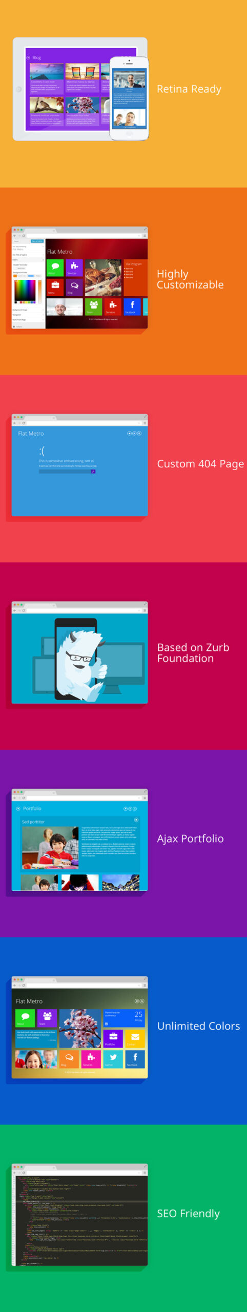 Falt Metro is a multipurpose, fully responsive WordPress theme. The Theme is powered by Zurb Foundation Framework and can be a base for any kind of project. Easy color and image selection with many design settings can help you transform MetroStyle into a unique business selling tool.