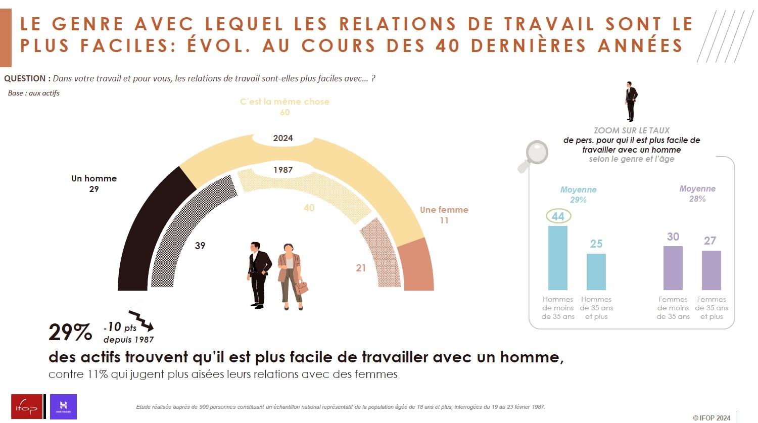 Le nombre d’actifs qui déclarent aujourd’hui qu’il leur est plus facile de travailler avec un collègue masculin a baissé de manière significative en une quarantaine d’années. Ils étaient en effet 39% à le déclarer dans une enquête menée en 1987 contre 29% en 2024. Pour 6 actifs sur 10 aujourd’hui, les relations sont les mêmes quel que soit le genre. Par ailleurs, la proportion de personnes estimant qu’il est plus aisé d’avoir des relations au travail avec une femme a, elle aussi, diminué, passant de 21% en 1987 à 11% actuellement.