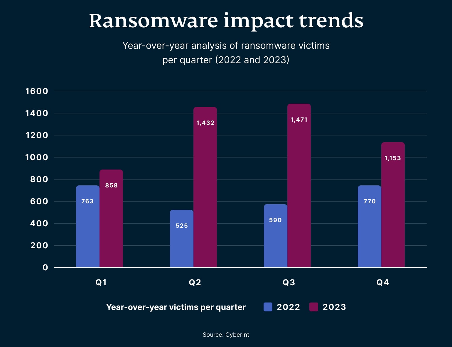 2023 marked the worst year on record for ransomware activities. With total ransom payments soaring to a staggering 1 billion USD, as tracked by Chainalysis, digital extortion saw a significant shift. The increase wasn’t just in terms of money—CyberInt reported a dramatic 56% surge in ransomware incidents, tallying over 4,368 attacks. This data includes reports from news and ransomware gangs who often publicize their victims on dark web sites to pressure them by threatening to release stolen data.