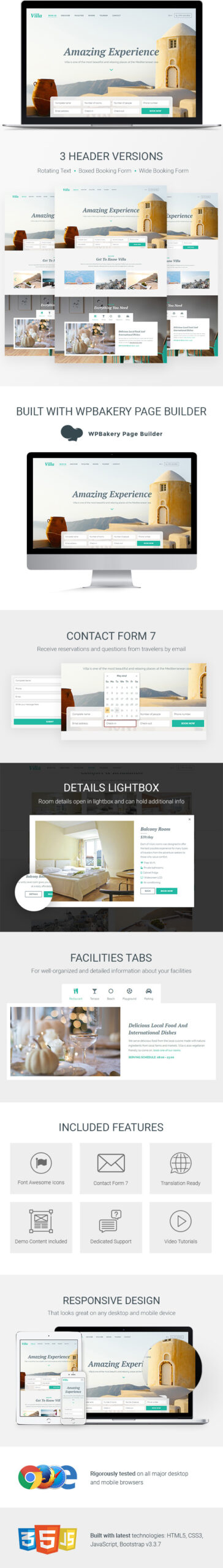 Villa is based on the popular WPBakery page builder to simplify the customization process for the user and it also integrates Contact Form 7 for reliable booking messages and reservations.