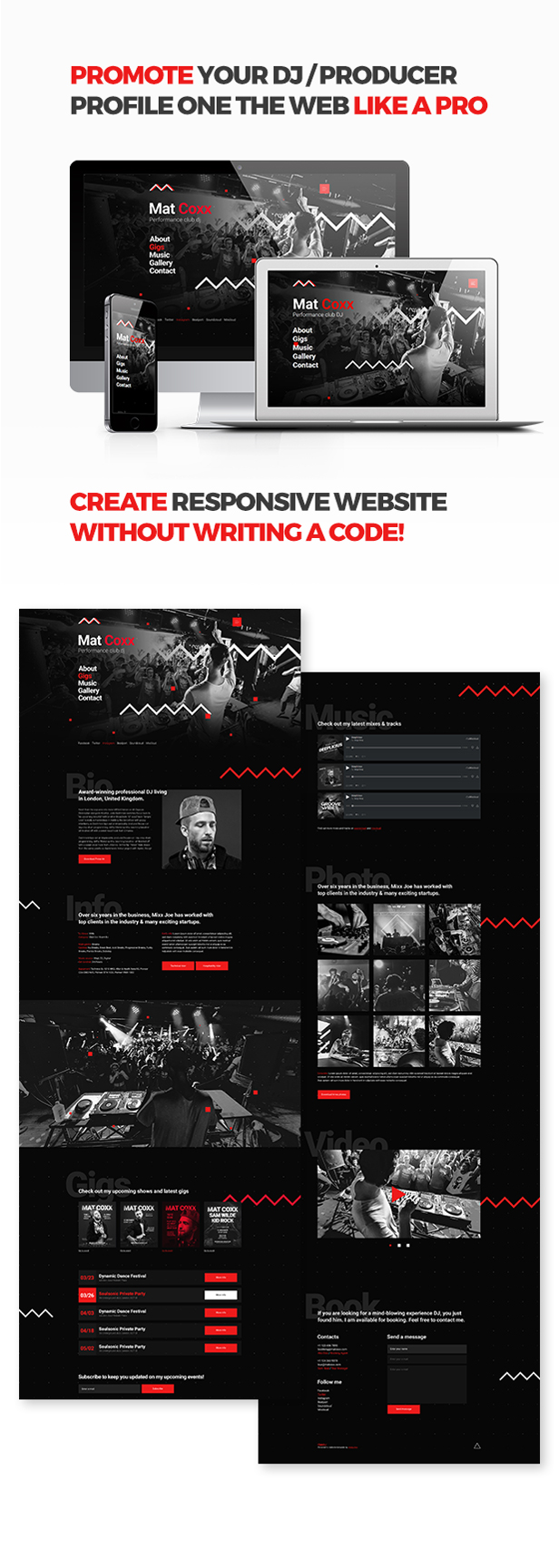 Whoever you are – club DJ, mobile DJ, wedding DJ, bedroom DJ or music producer – CuePlay template is exactly what you need! Template comes with powerful features: about/personal info section, about DJ section, audio podcasts/mixes section (you can add your audio from soundcloud, mixcloud, beatport etc), video podcasts section with embed youtube / vimeo video, subscribe to newsletter form, photo gallery, contact form and social links buttons.