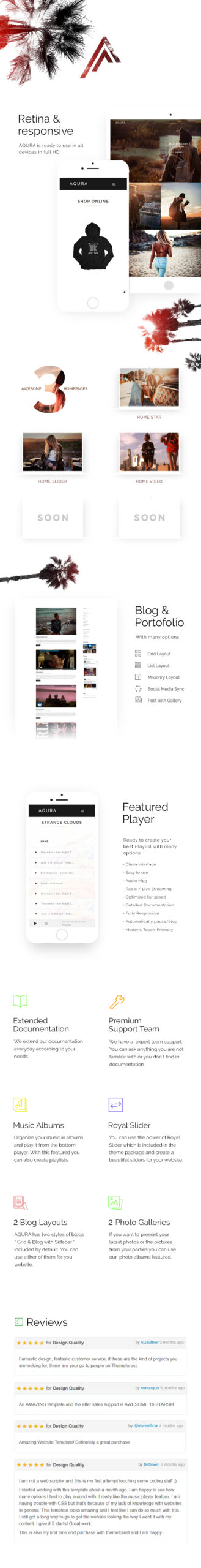 AQURA is an enchanting and easy-to-use parallax Music, Bands & DJ’s HTML theme that allows you to tell your story in a dynamic, narrative and enjoyable way, making it perfect for musicians and DJ’s.
