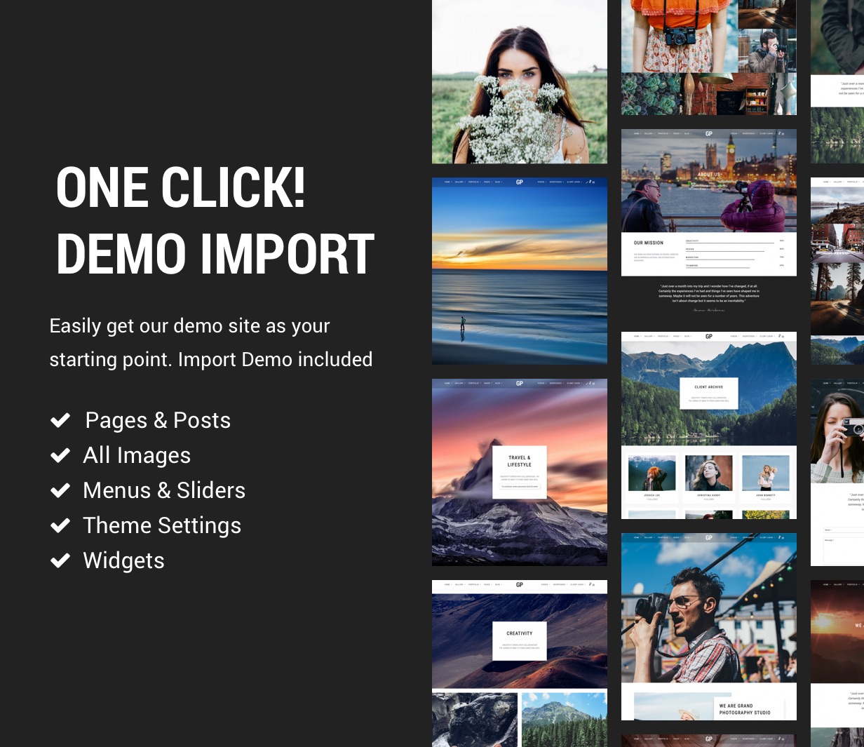• Only One Click for Importing Demo Contents Quickly and easily import our demo contents including pages, posts, sliders, widgets, theme options and other settings with only one click.