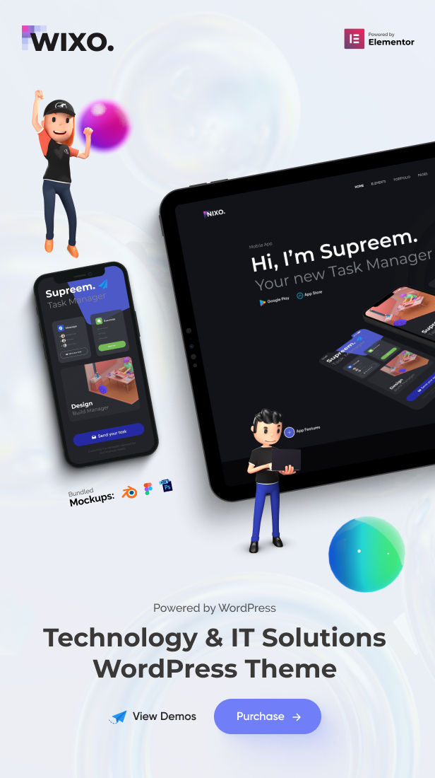 *All images are bundled in the theme in the source zip file. All mockups, 3D characters can be used only with our theme!