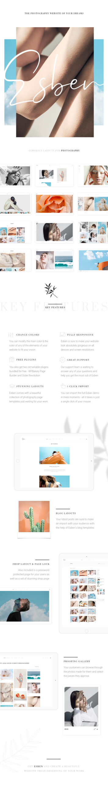 Introducing Esben, an elegant and minimalistic fashion photography theme for every contemporary photographer and photography studio out there. It comes bundled with all the photography specific layouts a photographer or a fashion photography studio can wish for. You get a wide assortment of beautiful and fully flexible photography and fashion showcase layouts. In addition to this, you do not need to know a single line of code to create a truly fantastic website with Esben; it’s that great. Get Esben today and create a fashion photography website in no time!