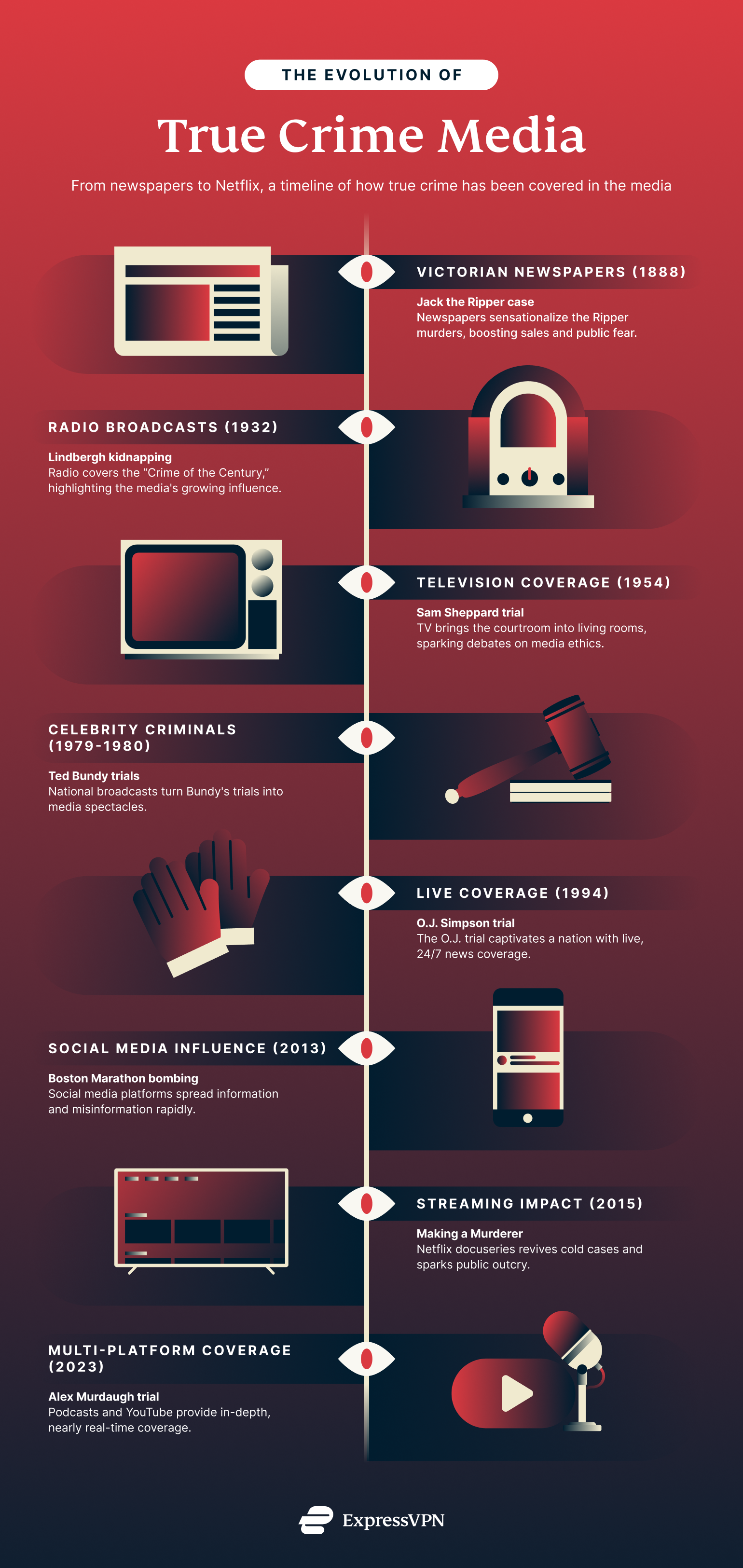 - The evolution of true crime media spans from Victorian newspapers to modern streaming platforms.