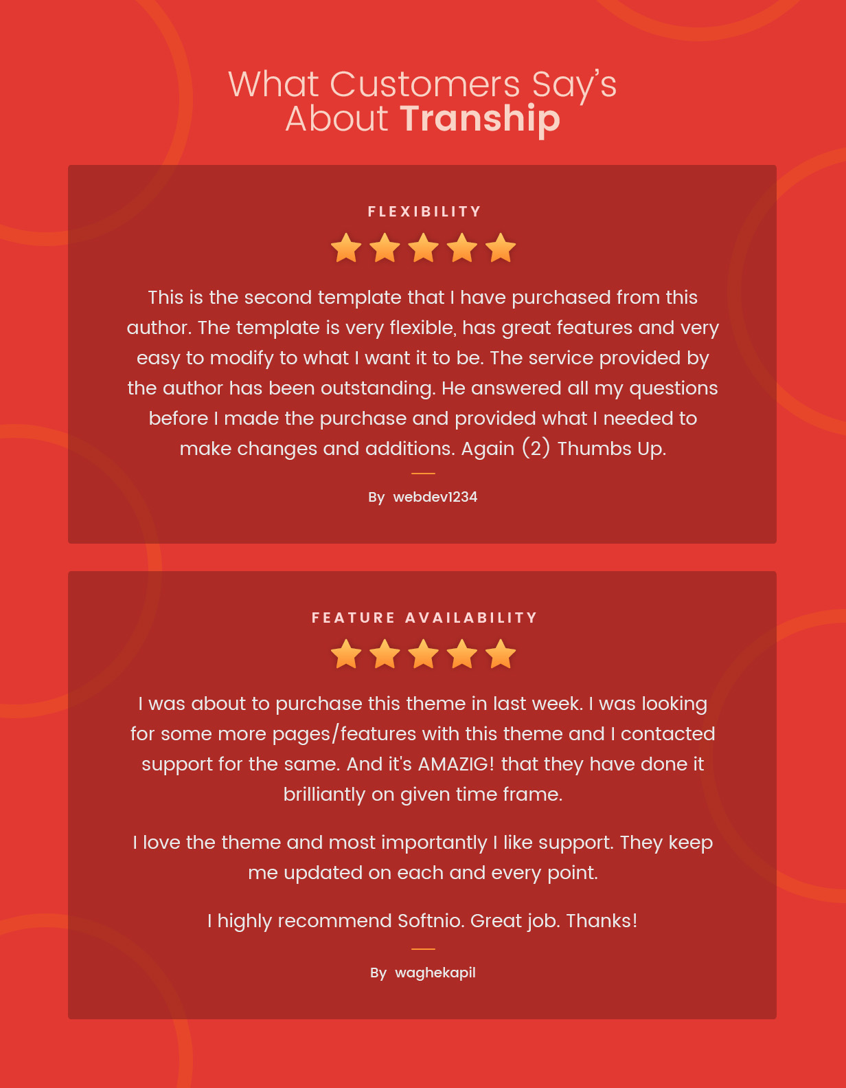 Tranship is based on Bootstrap 1170px grid system. All files are clearly organised we believe it will be easy to use and edit them. The design is very clean, elegant and modern. Any one can customize this template as his wishes.