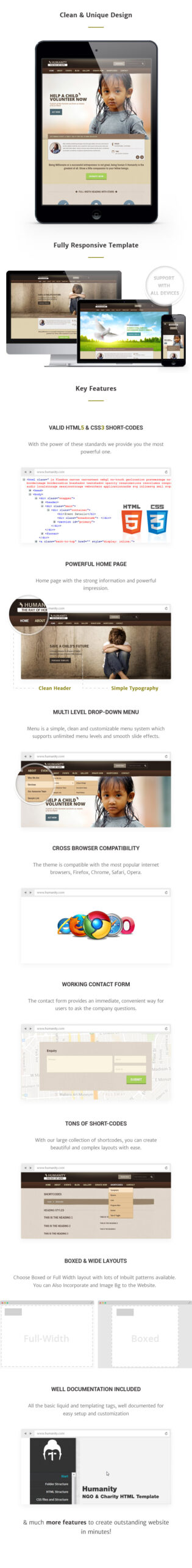 Humanity is a clean, fully responsive template designed for NGO’s and Charity Organisations. Template works in all the major browsers, supports devices ranging from mobile phones, ipad, tablets and PC.