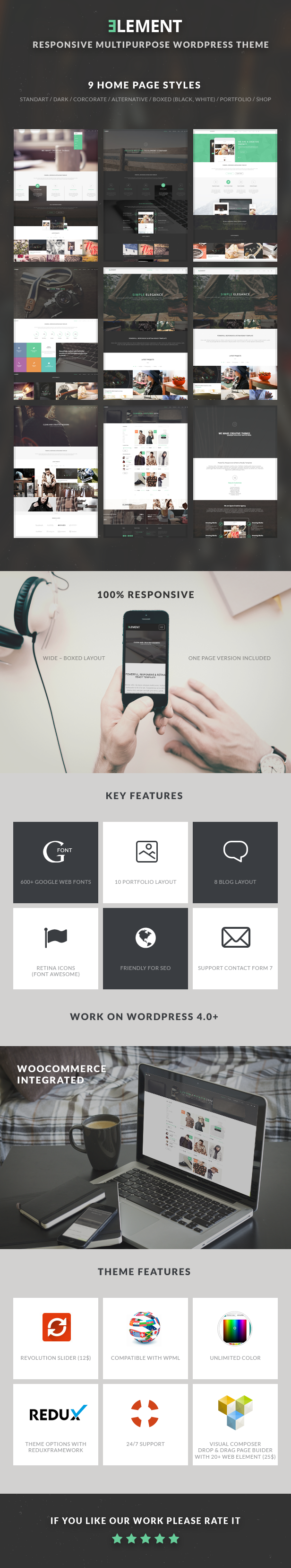 Element – is clean Multipurpose WP Theme and ecommerce theme. It is great, professional and easy to use. You can use it for, business, Photo Studio, Freelancers, Portfolio Theme, Creative Agency etc.