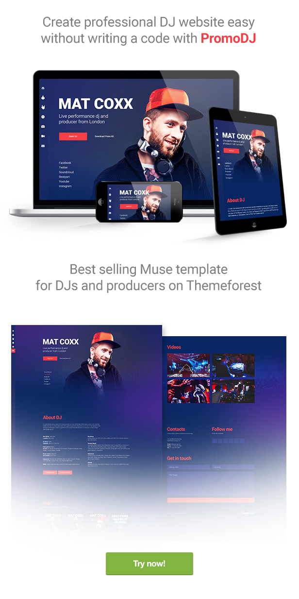 PromoDJ template is a clean, minimal and ready to use responsive Adobe Muse template for DJ. Whoever you are – club DJ, mobile DJ, wedding DJ, bedroom DJ or music producer, band – PromoDJ theme is exactly what you need! All you need is here: biography/personal info section, upcoming events section, photos and videos, contact form and social links.