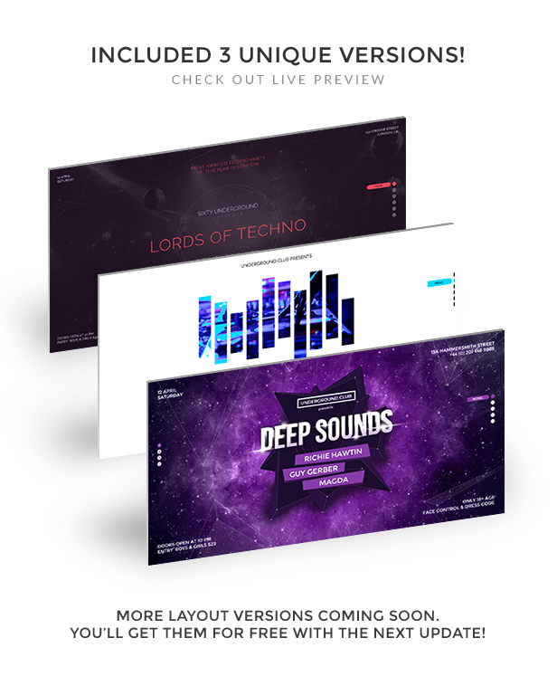 Party Promoter is the one-page website template with motion and parallax effects created for promote your dance event, club party or festival.
