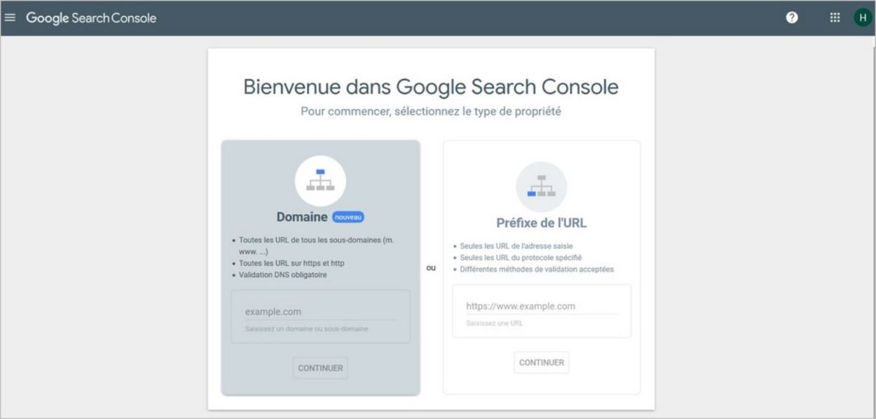 Il existe une deuxième méthode de validation, souvent un peu plus simple pour les débutants car elle n’implique pas de toucher à la configuration du nom de domaine : le préfixe de l’URL. Vous entrez cette fois-ci une URL précise, celle de votre site (avec http ou https, avec ou sans www en fonction de ce que vous utilisez au quotidien). Google Search Console pourra ainsi suivre toutes les pages commençant par cette adresse.
