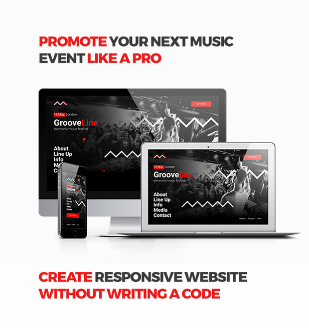 GrooveLine is a fully responsive Muse template suitable for any kinds of music events. It can be used for: festival, club party, rave, open air, concert, nightclub, music band, DJ and other performers.