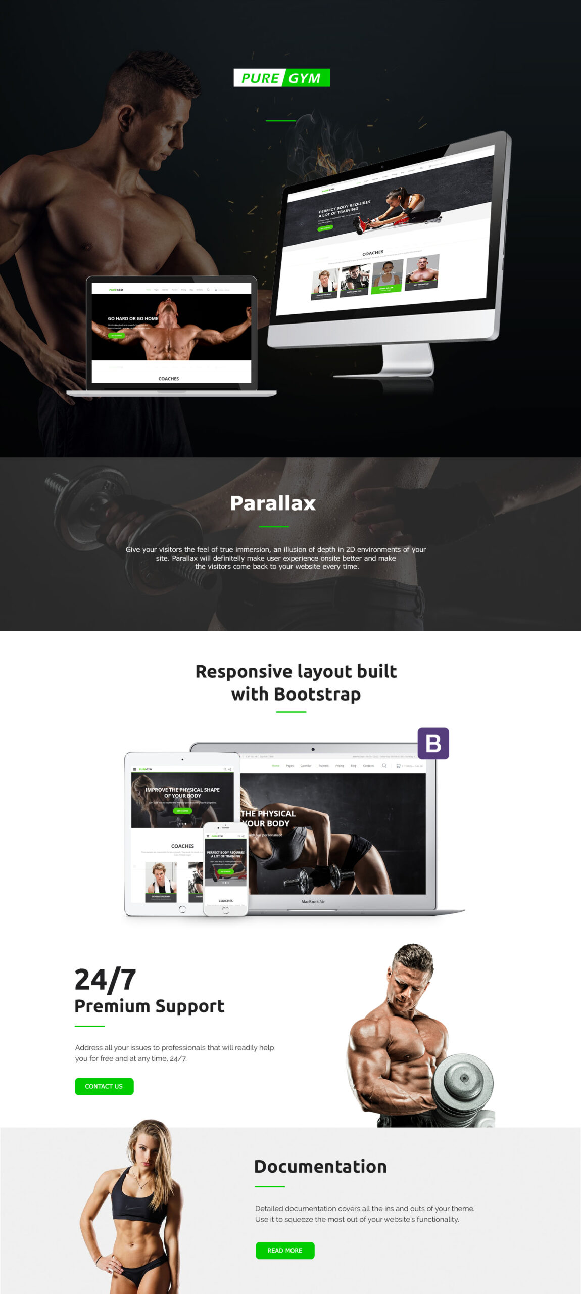 This modern PureGym – Sport & Gym HTML5 Responsive Template will delight the visitors of your sport club, combined simplicity and the new trends in web design. It has an attractive slider showing people athletic bodies, club programs are presented on cool square banners with ghost call-to-action buttons having rounded edges, coaches profiles come with photos. The parallax effect is making the difference in the potential clients and it’s user friendly interface.
