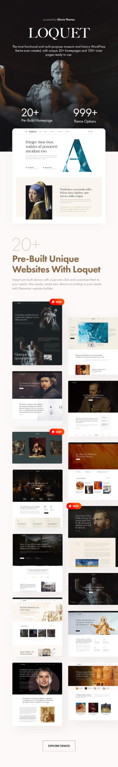 With over 20 ready-to-use homepages and 100+ pre-designed layouts, Loquet provides endless possibilities for creating a unique and captivating online presence. Whether you prefer a one-page or multipage layout, you’ll find the perfect design to showcase your museum, art gallery, or historical institution.