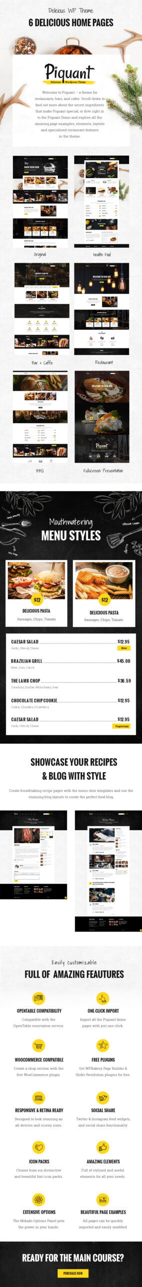 Find a perfect ingredient for a website perfection with Piquant! This delicious WordPress theme, made for every café restaurant, pub or bar, is packed with an amazing set of layouts and elements. Create an original restaurant presentation or allow your visitors to book a table easily with integrated Open Table reservation system. Piquant comes with a beautifully designed food menu and a collection of fast food templates made with care for your restaurant.