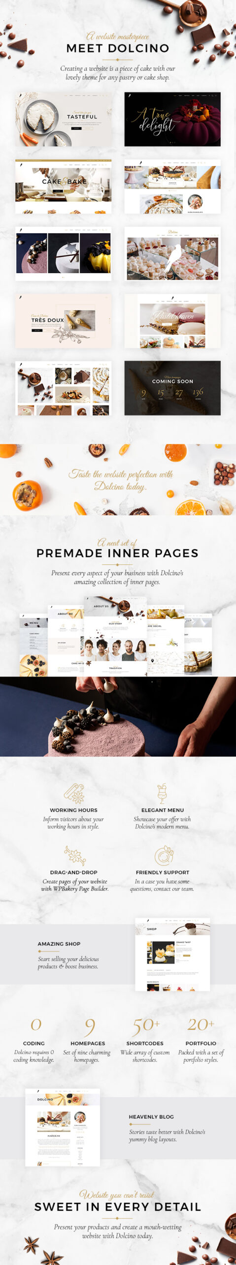 Welcome to sweet paradise! Made with care for any bakery, cake shop, confectionery or chocolaterie, Dolcino is a dream WordPress theme for anyone in the sweets industry. Packed with 9 elegant homepages and a large collection of inner pages, this theme is perfectly suitable for presenting cakes and desserts of any kind. If you run a dessert shop or are an expert for sweets and chocolate, search no more. Dolcino comes with elements for every taste and is created to impress all the sweet lovers. Get Dolcino today and delight your customers!