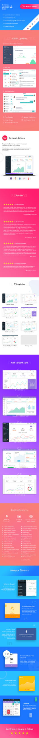Robust Premium Bootstrap 4 Admin, Dashboard & WebApp Kit Template can be used for any type of web applications: Project Management, eCommerce backends, CRM, Analytics, Fitness or any custom admin panels. It comes with 5 niche dashboards. Robust admin template is powered with HTML 5, SASS, GRUNT. Twitter Bootstrap 4 which looks great on Desktops, Tablets, and Mobile Devices. Robust Premium Bootstrap 4 Admin, Dashboard & WebApp Kit Template comes with starter kit which will help developers to get started quickly.