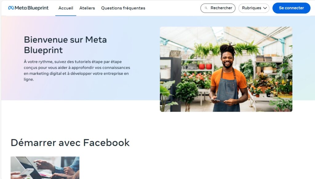 Créée par Meta, Meta Blueprint (anciennement Facebook Blueprint) offre des cours et des certifications pour les professionnels du marketing. Elle s’adresse aux annonceurs et à toute personne souhaitant améliorer ses compétences en marketing digital sur les plateformes Meta. Avec cet outil numérique, vous accédez gratuitement à une centaine de cours en ligne qui couvre plusieurs domaines dont le marketing digital, et à une multitude d’autres ressources pédagogiques (webinaires, guides, études de cas, articles de blog, etc.)