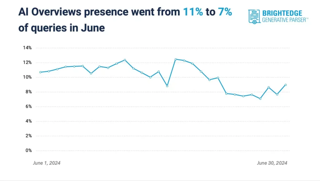 • Selon BrightEdge, les AI Overviews apparaissent seulement dans 7 % des recherches sur Google.