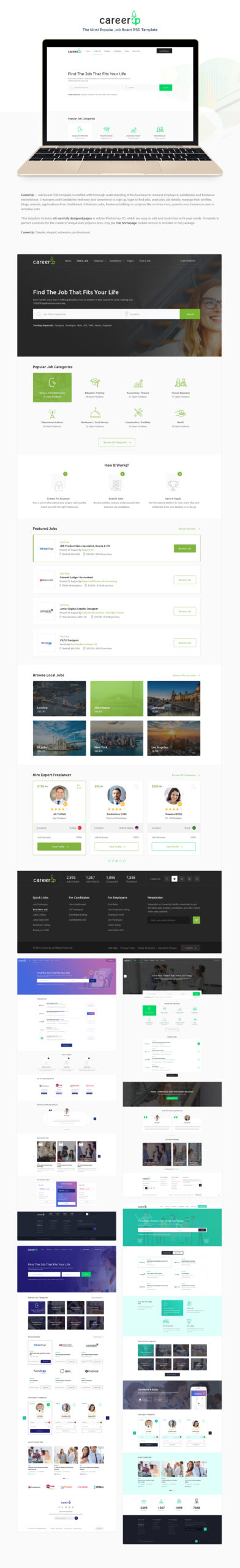 CareerUp – Job Board PSD template is crafted with thorough understanding of the business to connect employers, candidates and freelance marketplace.Employers and Candidates feel easy and convenient to sign up, login to find jobs, post jobs, job details, manage their profiles, blogs, resume, applications from Dashboard. It features jobs, freelance bidding on projects like on fiverr.com, upwork.com, freelancer.com or airtasker.com