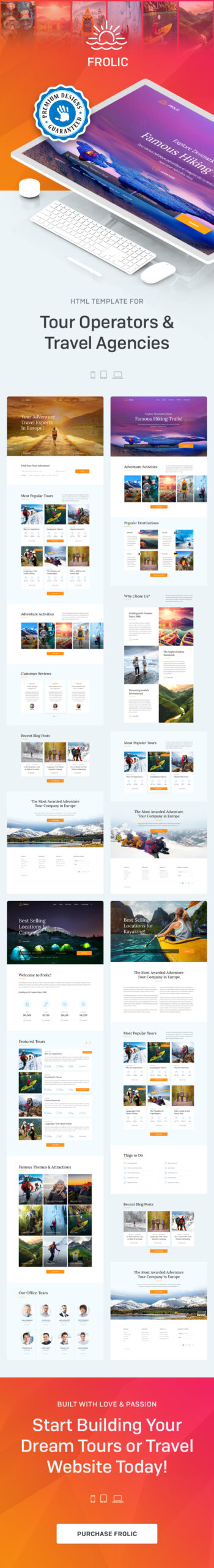 FROLIC is a premium HTML template for Travel and Tours based companies or websites. It offers a complete solution starting from searching for tours or trips and ending with checkout and payments. We’ve designed each and every page needed to complete the entire booking process in a modern and intuitive way to maximize user experience. All the sections in the HTML files are properly commented and named which makes it very easy to find, change or customize any text, images, icons or anything else for that matter.