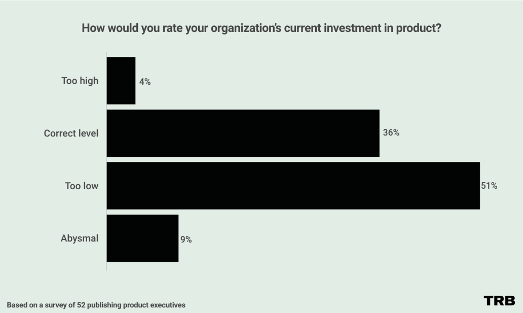 Respondents also indicated the difficulty they face in securing the necessary level of investment to uphold a high-performing, cutting-edge tech product. More than 50% rated their organization’s investment in their product as insufficient. One anomaly: The New York Times, in contrast, boasts a formidable product division.