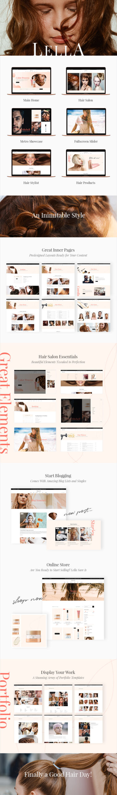 Finally, the good hair day is here! Presenting Lella, a stylish theme for all types of hairdresser and beauty salon websites, packed with all the hair salon essentials you can imagine – you get booking form templates, full WooCommerce compatibility, and all the hairdresser and beauty salon templates you can ever need. Get a hair salon site of inimitable beauty, get Lella today!