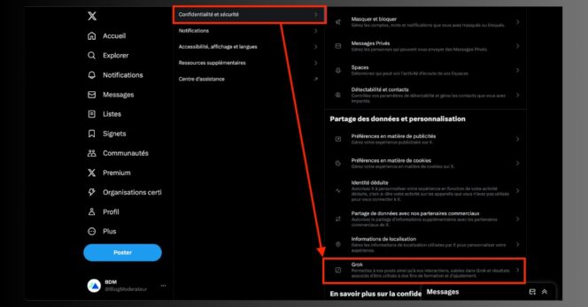 La case permettant à Grok d’utiliser vos contenus est cochée par défaut. © Montage BDM
