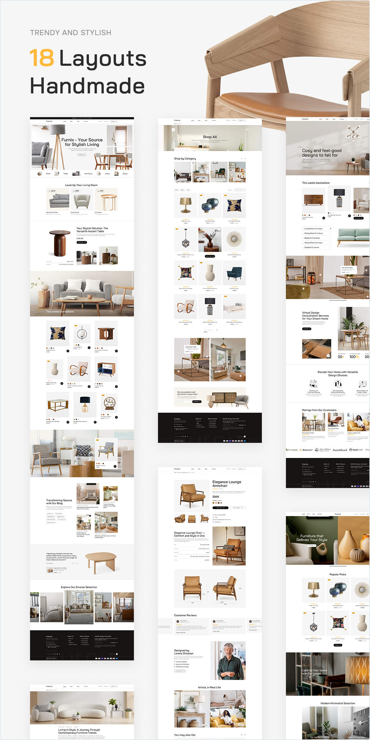Furnix has been meticulously designed for Furniture Stores, Online Retailers, E-commerce Shops, and contemporary Furniture Services. Boasting a sleek design, soothing color palette, and an intuitive interface, this template ensures an online shopping experience that will captivate and satisfy your customers.