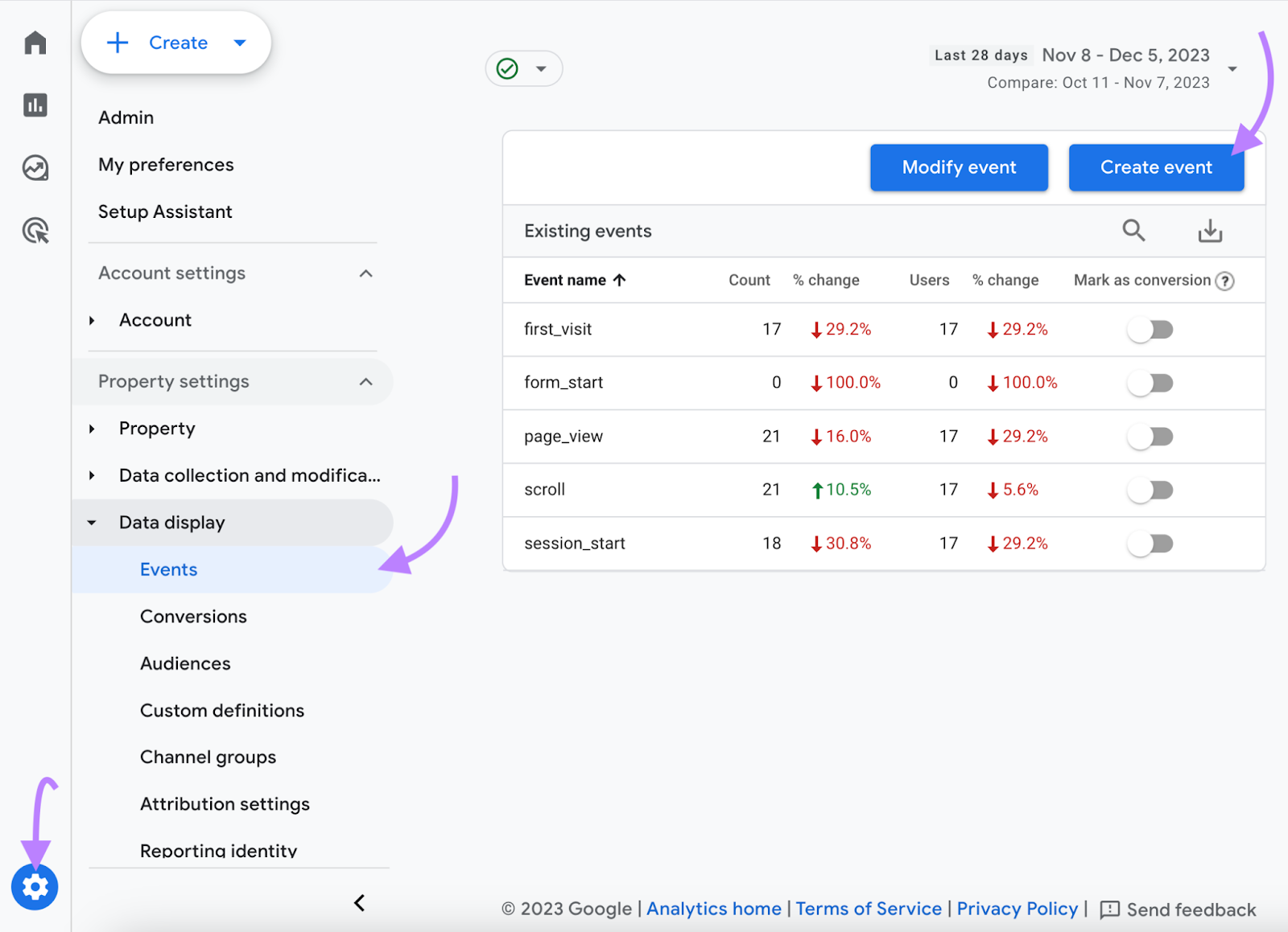 Entre dans Google Analytics 4, puis navigue vers l’icône d’engrenage, clique sur “Événements“, et clique sur “Créer un événement“.