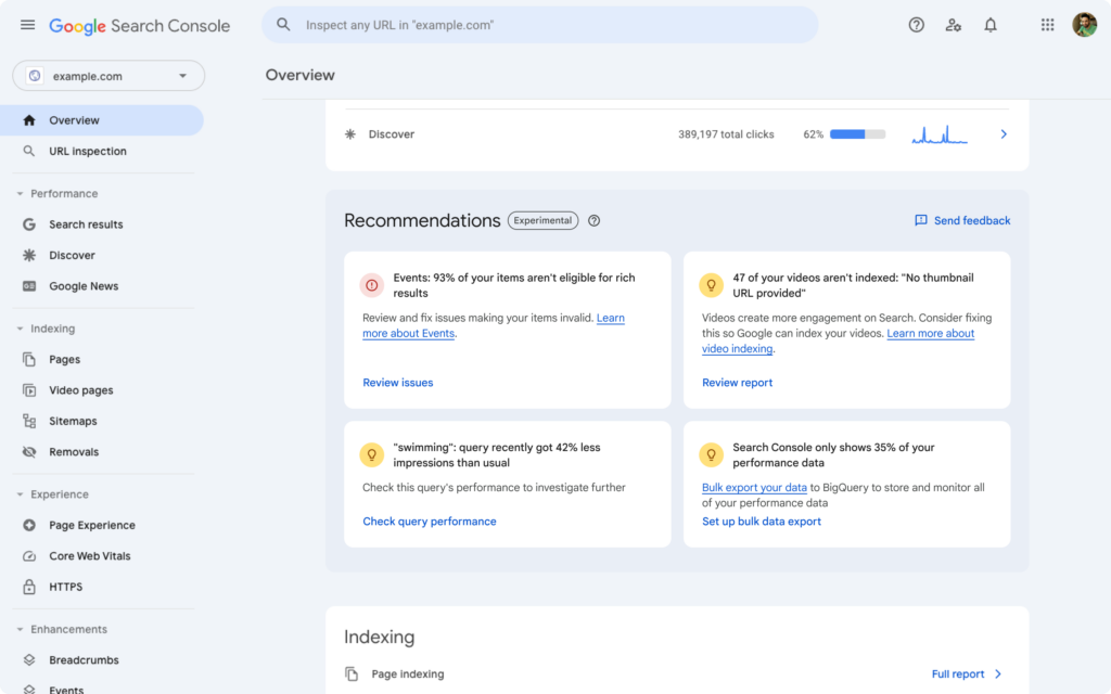 Les recommandations sont des suggestions personnalisées d’optimisations qui apparaissent directement dans l’onglet “Vue d’ensemble de Google Search Console. Elles sont mises à jour régulièrement et peuvent changer ou expirer au fil du temps. Leur but est de rendre les données SEO plus accessibles et exploitables, en proposant des actions prioritaires comme l’utilisation de données structurées, l’ajout de sitemaps, ou l’analyse des requêtes et pages en tendance.