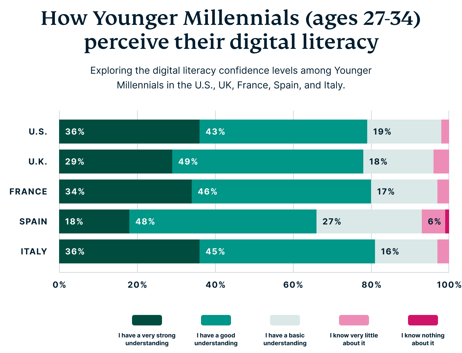 When it comes to understanding technology, not all generations—or countries—are on the same page. Our survey results reveal just how varied digital literacy can be, with some generations feeling more confident than others when navigating technology. But across generations, we’ve found that respondents in Spain are the least confident using modern technology, with those in the U.S. and Italy relatively high in self-reported digital literacy.
