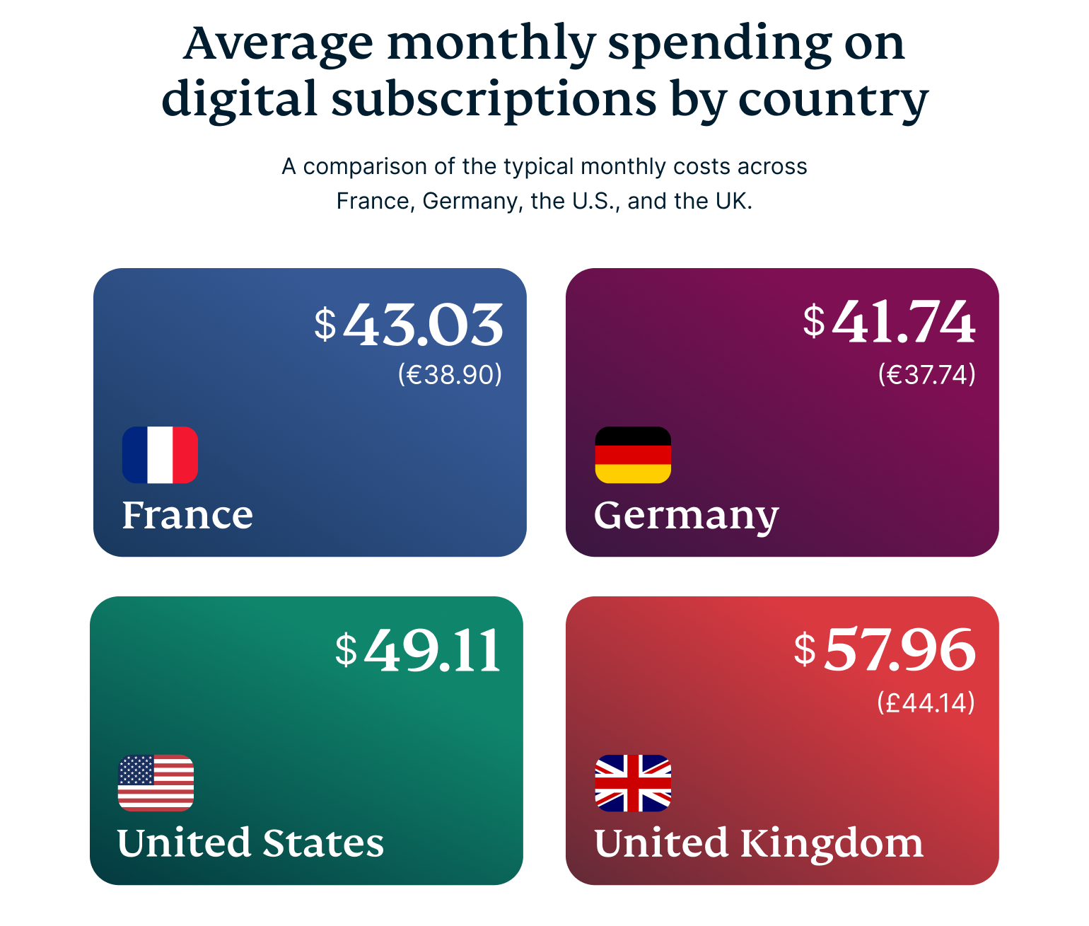 In France, for instance, a significant portion of people—23%—spend 11-20 EUR (12-22 USD) per month on their subscriptions. A quarter of respondents spend even more, landing in the 21-40 EUR (23-44 USD) range. The picture is similar in Germany, where 27% of people are spending 21-40 EUR monthly.