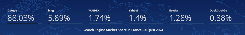 Bien qu’il n’existe pas de données officielles concernant l’adoption de Bing Webmaster Tools en France, il suffit de jeter un œil aux parts de marché de Bing dans l’hexagone pour se faire une idée relativement représentative de l’engouement suscité par cette suite d’outils. Selon StatCounter, Bing représente 5,9 % de parts de marché en France, en août 2024. Nous sommes évidemment bien loin des 88 % de Google sur la même période.