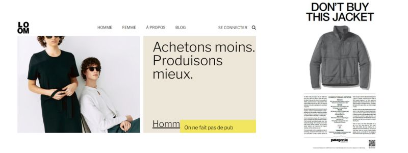 « Achetons moins. Produisons mieux ! » Ce n’est pas un slogan d’ONG mais la baseline de LOOM, marque de vêtement qui se veut durable, avec des coupes intemporelles, des matières saines et une production européenne. Il emprunte aux codes de Patagonia, un pionnier du genre, qui en 2011 se payait le luxe de prendre un page dans le New York Times pour inciter les lecteurs à ne pas acheter la veste de la publicité (Don’t buy this Jacket). Ce marketing à l’envers ou démarketing, commence à se faire une place au sein des entreprises engagées, voire au-delà.