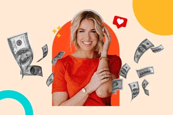 Podcasting for business growth graphic with images or money and likes and an image of entrepreneur Jenna Kutcher