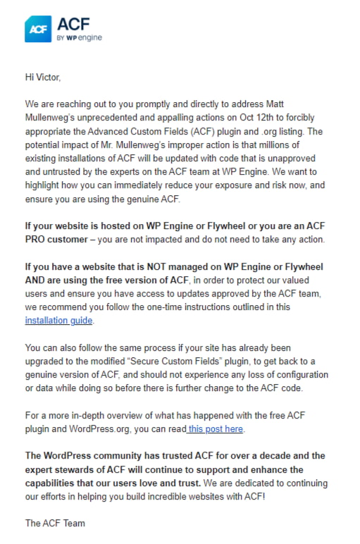 En réponse à cette prise de contrôle, WP Engine a pris des mesures pour permettre à ses utilisateurs de continuer à utiliser ACF en toute sécurité. Pour les clients de WP Engine, Flywheel, et ACF PRO, la situation reste stable : ces utilisateurs continueront à recevoir les mises à jour régulières directement de l’équipe ACF.
