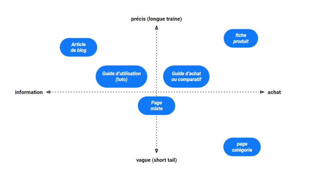 En SEO, l’intention de recherche guide le choix du template. Chaque template a pour objectif de cibler un type de mots-clés, que l’on peut résumer par ce schéma :