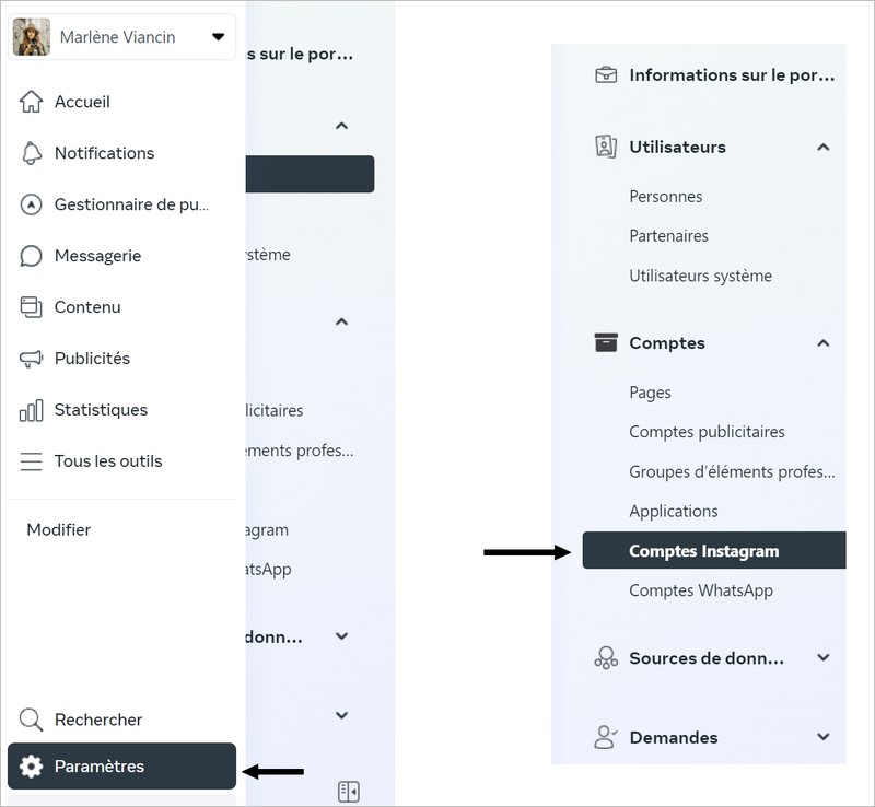 Si vous n’avez pas encore fait cette association, connectez-vous avec votre compte Facebook habituel puis cliquez sur la roue dentée dans le menu de gauche pour accéder aux paramètres. Dans le menu qui s’affiche, cliquez sur “Comptes Instagram”.