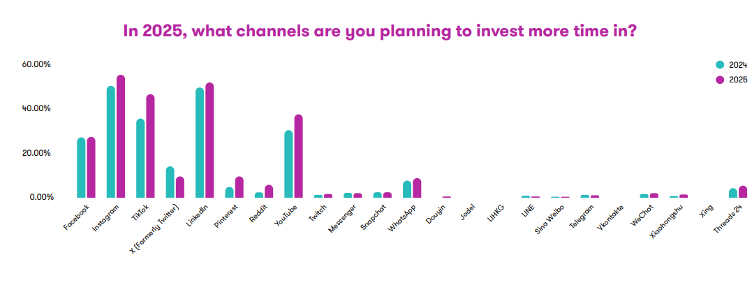 Une baisse de popularité qui semble ne faire que débuter, puisque selon Meltwater, plus de 30 % des organisations souhaitent réduire leur temps consacré à ce réseau social. X (anciennement Twitter), semble subir le même sort : depuis son rachat par le milliardaire Elon Musk, plusieurs milliers de ses utilisateurs quittent le réseau à la suite de la prolifération de fake news, de toxicité ou du manque de modération. Environ 40 % des entreprises interrogées vont investir moins de temps sur le réseau social pour l’année à venir. A contrario, Instagram, TikTok, LinkedIn ou encore YouTube semblent rester populaires auprès des sociétés mondiales, puisque qu’une majorité d’entre elles souhaite y consacrer plus de temps en 2025.