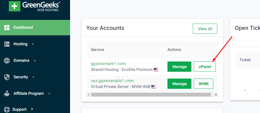 First, log in to your GreenGeeks account and click on the cPanel button beside your account of choice.