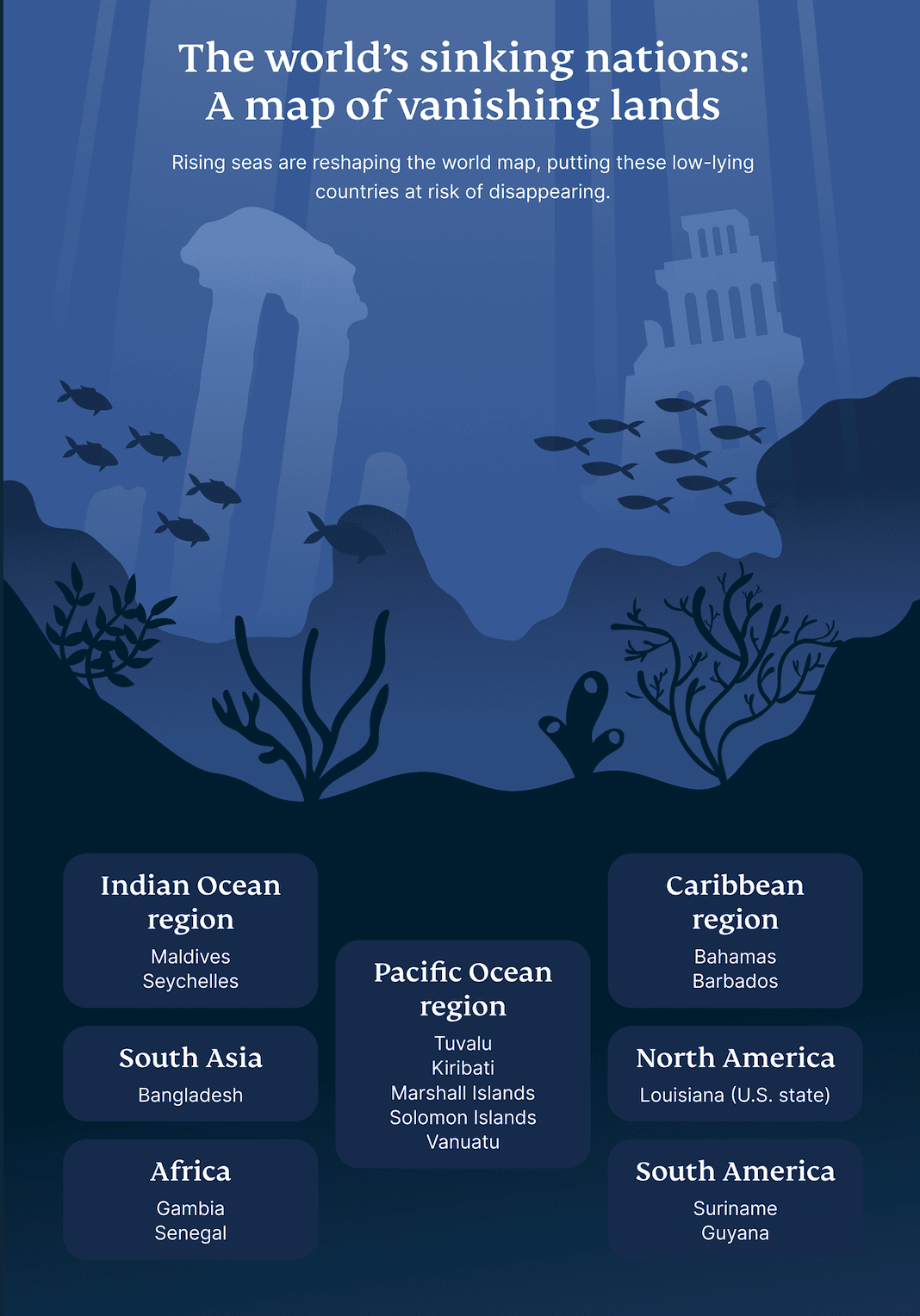 For many coastal and island regions, the ocean has always been a source of life—fueling economies, shaping cultures, and connecting communities. But now, it threatens to take it all away. Countries like Tuvalu, the Maldives, and Kiribati are among the most vulnerable. But they’re not alone. Across the globe, low-lying areas—from atolls in the Pacific and Indian Oceans to parts of Bangladesh and Louisiana—are facing the risk of disappearing beneath the waves.