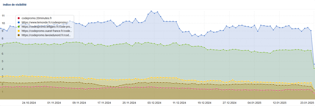 Ce 22 janvier 2025, plusieurs SEO ont remarqué une énorme chute des médias français sur les requêtes liées aux codes promos. Ce n’est pas sans rappeler la chute des médias anglophones en mai 2024, suite au déploiement de la politique anti-spam de Google liée à l’abus de réputation de site. Visiblement, cette politique est désormais déployée dans le monde entier, d’après les informations fournies par Alexis Rylko.