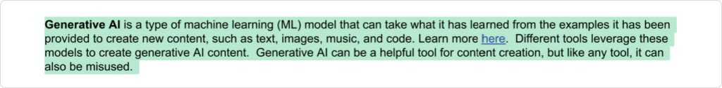 Google a ajouté une définition de l’IA générative. En français : “L’IA générative est un type de LLM qui peut utiliser ce qu’il a appris, à partir d’exemples, pour créer un nouveau contenu : texte, image, musique et code. Différents outils exploitent ces LLM. L’IA générative peut être un outil utile de création de contenu, mais comme tout outil, peut être utilisée à mauvais escient.”
